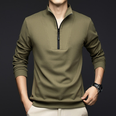 包邮 淘货源男士新款立领半拉链长袖T恤春秋冬商务休闲纯色长袖打底衫