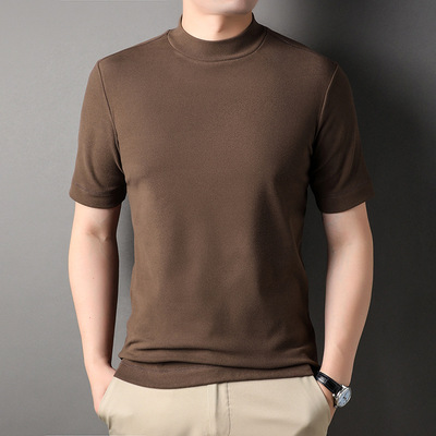 包邮 半高领德绒短袖T恤男潮2024春秋新款半袖中年休闲纯色男士打底衫