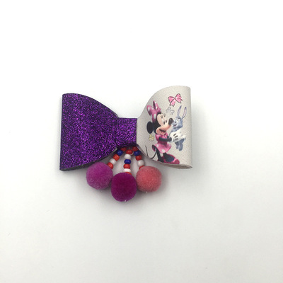 包邮 外贸儿童皮革印刷图案格利特细葱粉蝴蝶结发夹毛球串珠发夹发饰品