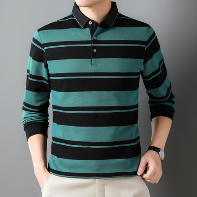 包邮 2024雅戈尓春季翻领T恤中年男装新品休闲爸爸装长袖条纹T恤衫潮