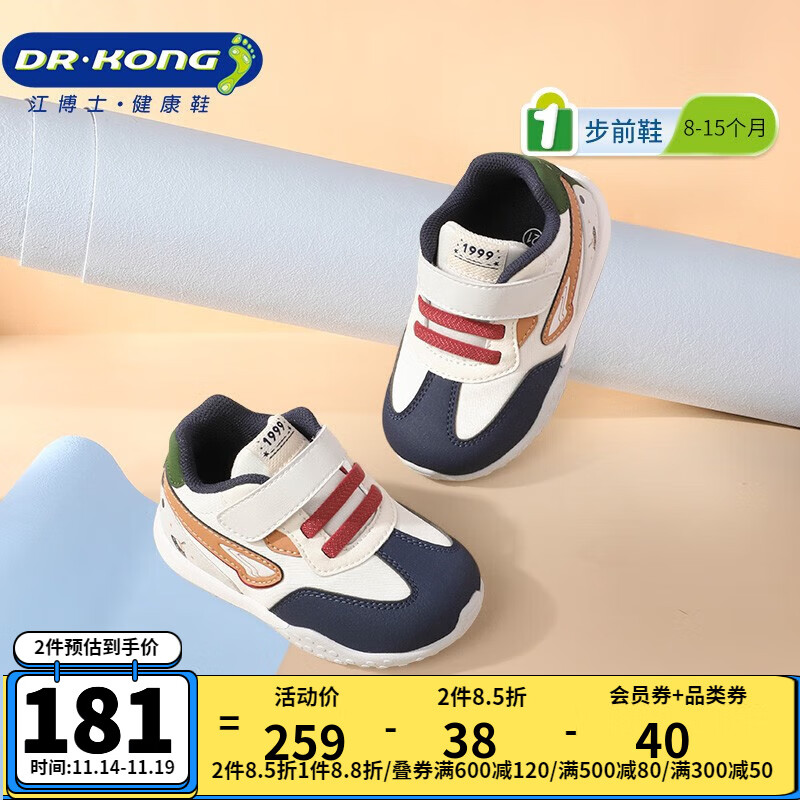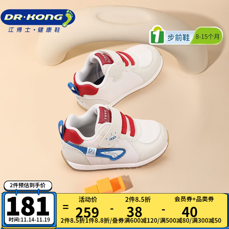 江博士(DR·KONG)秋季男女童简约幼儿步前鞋 舒适透气宝宝儿童鞋国货魔术贴学步鞋 杏/白 22码 适合脚长约12.7-13.2cm