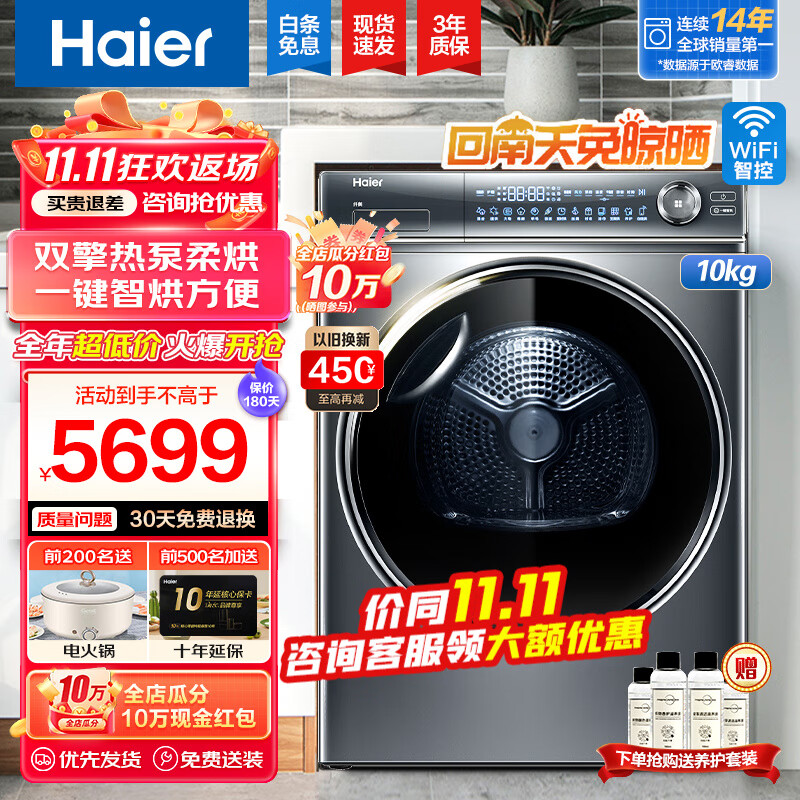 海尔(Haier)纤美176干衣机376/028烘干机 10kg大容量全自动高端纤美双擎热泵烘干机杀菌除螨衣干即停智能物联 【376双擎热泵烘干机】专属养护+4重线屑过滤