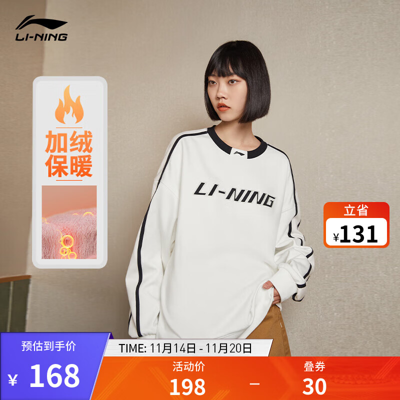 李宁加绒保暖卫衣男女同款秋冬复古宽松情侣款圆领运动上衣AWDTC49 【加绒】乳白色-1 M