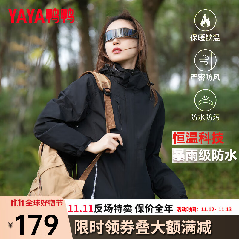 鸭鸭(YAYA)三合一冲锋衣女短款2023年秋冬新款时尚户外连帽保暖外套JX 黑色 165/88A(L)