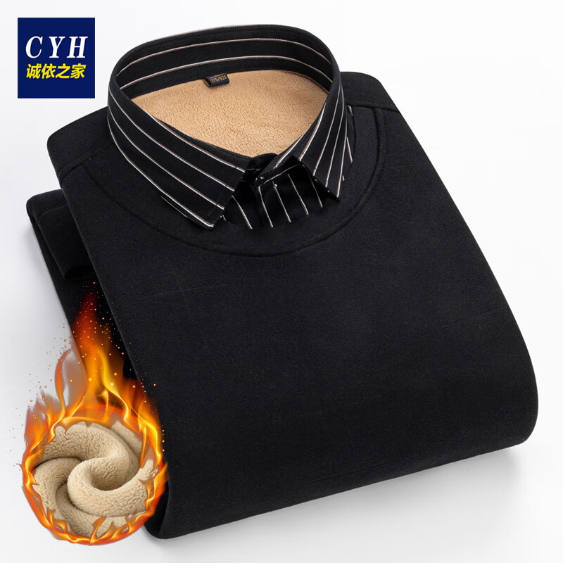 诚依之家假两件针织衫男2023冬装新款中青年加绒加厚衬衫领套头保暖上衣 黑色 195/4XL