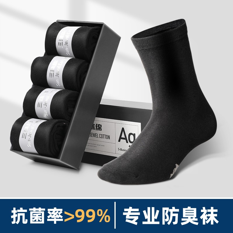 三珠绵 黑色袜子男四季高筒高棉商务长袜防臭吸汗透气抗菌 S013 黑色4双 长袜 男士均码