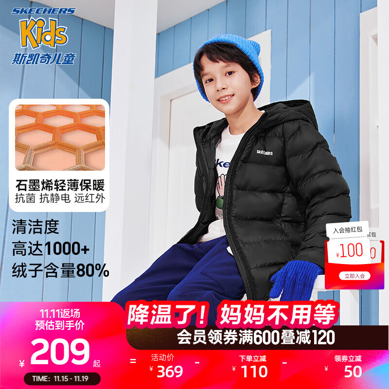 Skechers斯凯奇儿童羽绒服男童女童外套石墨烯蓄热保暖中大童冬装L422K138 碳黑/0018/石墨烯升级款 165cm