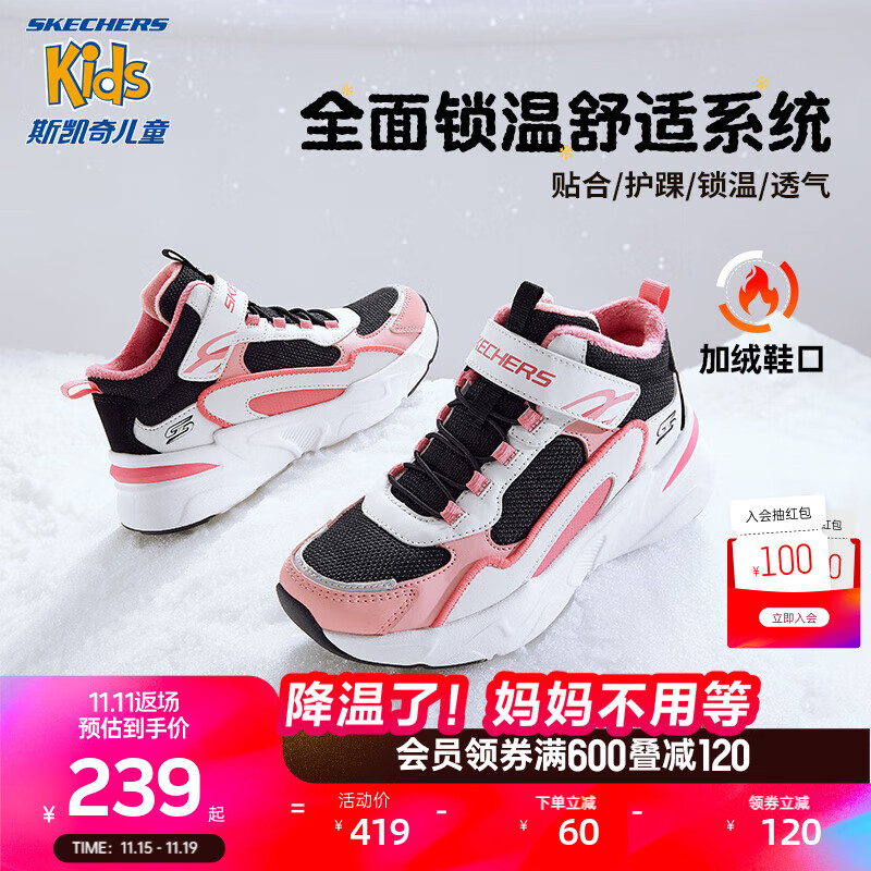 Skechers斯凯奇童鞋男女童棉鞋冬季防滑儿童加绒运动鞋中帮棉靴302527L 女-鞋口加绒/黑/白/粉红/BKWP 33.5