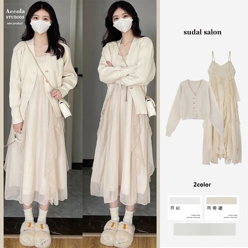 妍莉芬(yanlifen)连衣裙女装2023年秋冬新款韩版套装中长款吊带裙法式针织裙子秋装 白色上衣+吊带裙 M(建议95-110斤)