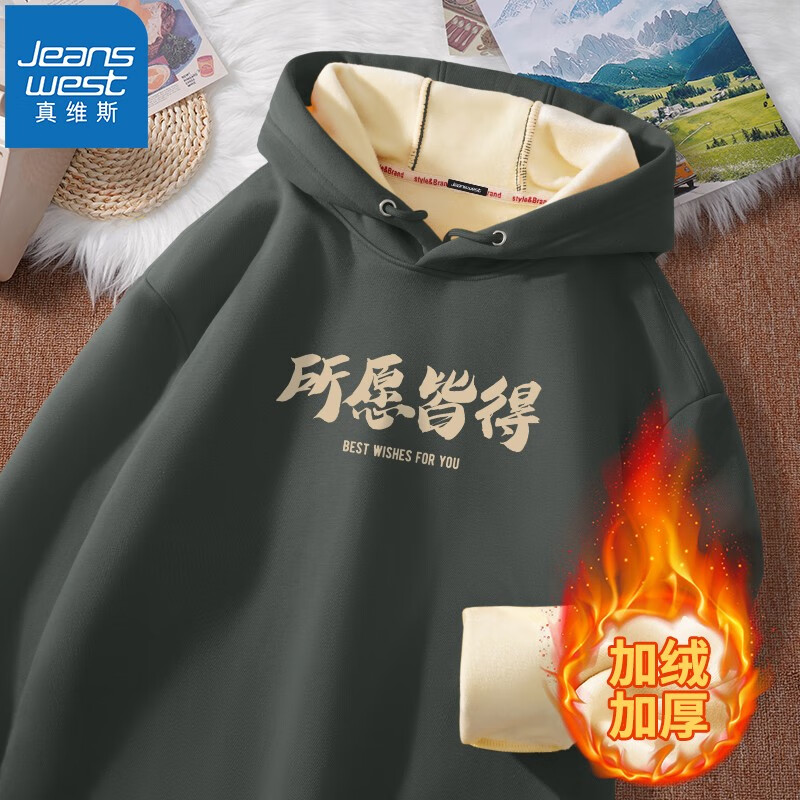 真维斯(JEANSWEST)加绒连帽卫衣国风加厚套头衫学生休闲款衣服国潮文字印花2023新款 深灰(所愿皆得) XL(推荐130-150斤)
