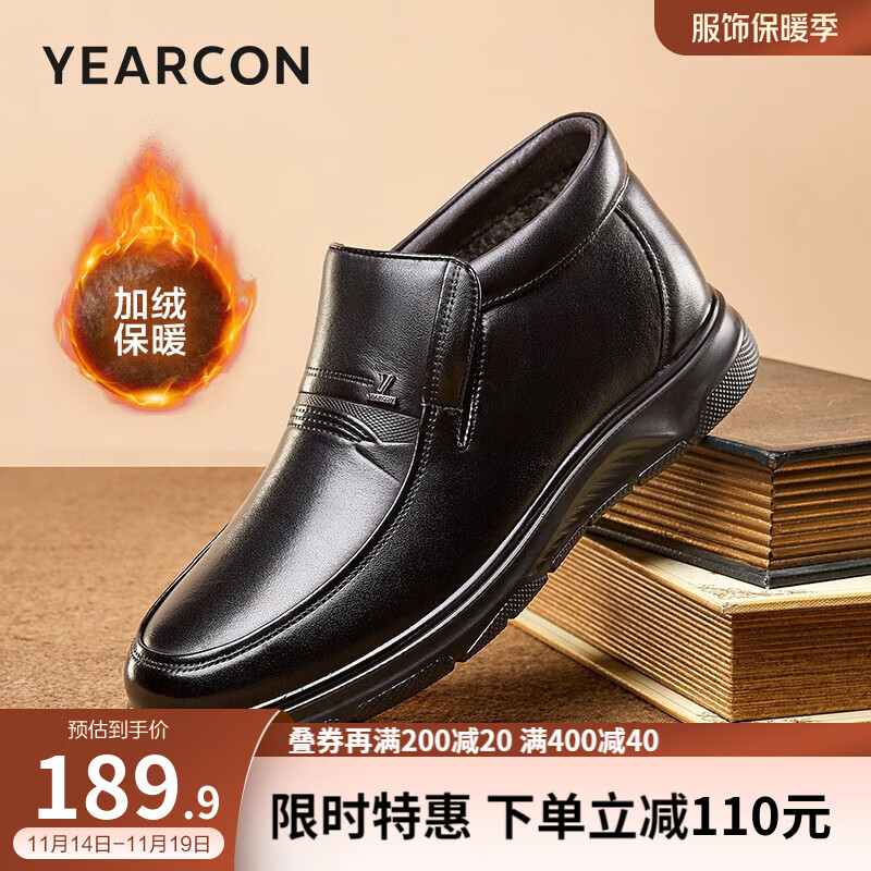意尔康男鞋 皮鞋男2023冬季新款牛皮加绒加厚保暖棉鞋套脚中老年爸爸鞋 黑色 42