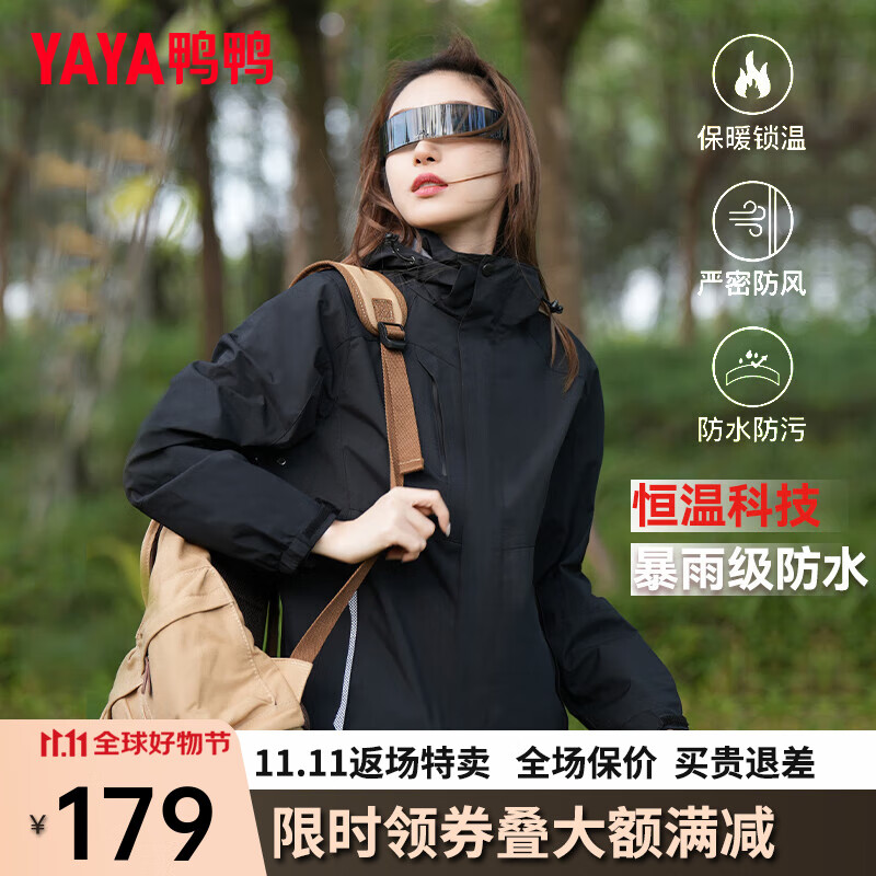 鸭鸭(YAYA)三合一冲锋衣女短款2023年秋冬新款时尚户外连帽保暖外套JX 黑色 170/92A(XL)