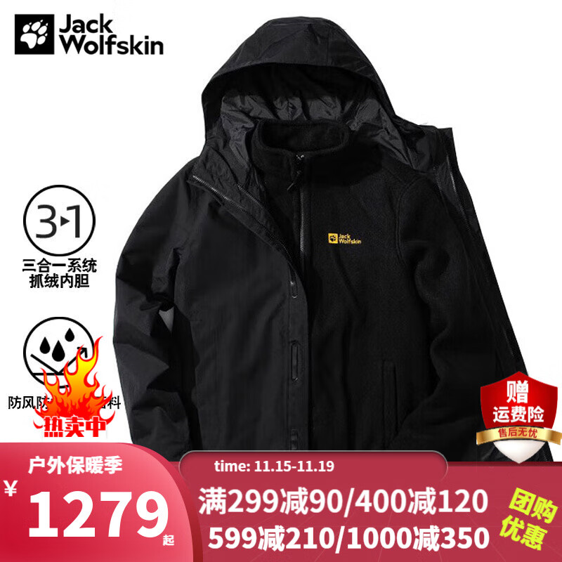 Jack Wolfskin狼爪冲锋衣男秋冬新品运动防风防水宽松大码抓绒内胆三合一夹克 776-6000/黑色/建议拍大一码 M 175/96A