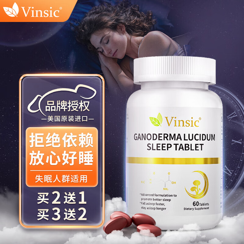Vinsic美国进口褪黑素氨基丁酸灵芝安睡片维生素b6改善睡眠失眠退黑色素安眠成人老人学生1瓶装60粒